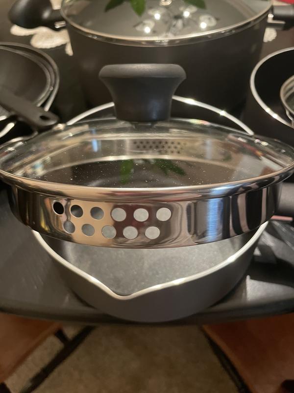 I needed some new cookware so I got this T-fal Initiatives cook set. It's perfect. It comes with everything I need to make a meal. I love that the lids have pour spouts for easily pouring out liquids. This set is very nice looking. Everything stores away very easy as well.