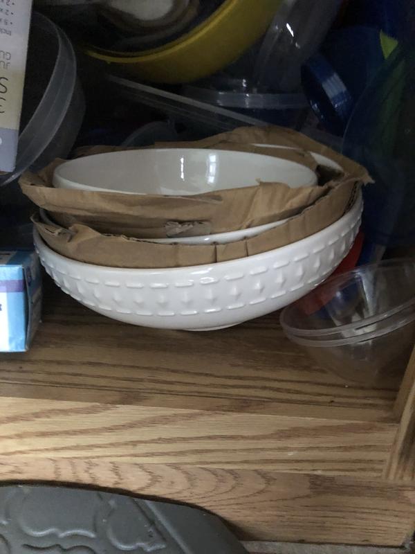 This set is truly stunning and timeless. Honestly could match anyone’s home. Durable porcelain, microwaveable, dishwasher safe and easy to store! Large medium and small nest together perfectly. They have a beautiful design that is simple and chic. Great quality and would recommend.