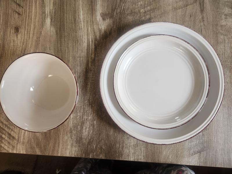 Beautiful 12 piece white farmhouse dinnerware. They are very sturdy so I feel they are a great value. The patter is simple which is what I was going for and it came with the main plate, small plate and bowl.