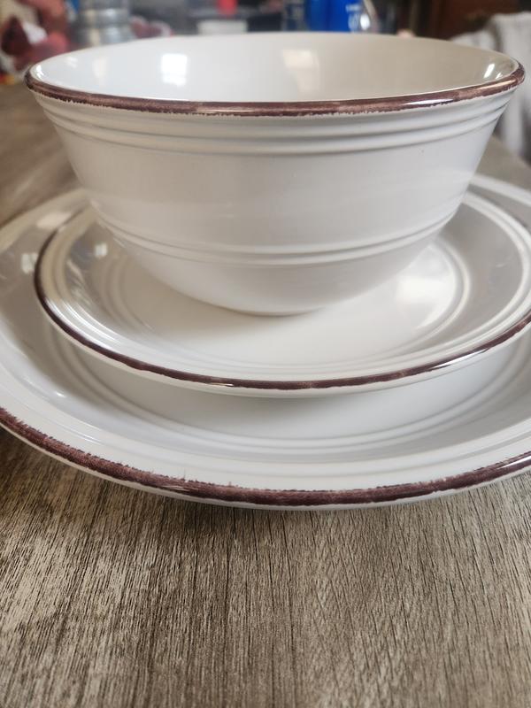 This review of the Tabletop Gallery Farmhouse service for 4. These white china plates have a brown brush stroke style detail on the rim. The brush stroke looks rough but the china edges are all smooth and polished. The brown detail is on all 12 pieces. 4 large dinner plates, 4 smaller plates and 4 bowls. The bowls look impressively deep! The bowls can still be easily used with a normal sized spoon. All 12 pieces are dishwasher and microwave safe. The 8 plates have congruent ridges circling the edge and inside of the plates and the bowl has the same ridge on the outside of the bowl, leaving it smooth inside. The dinner plates are more curved than flat so juice will collect in the center.
