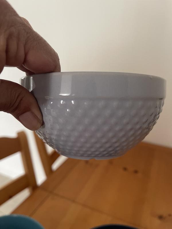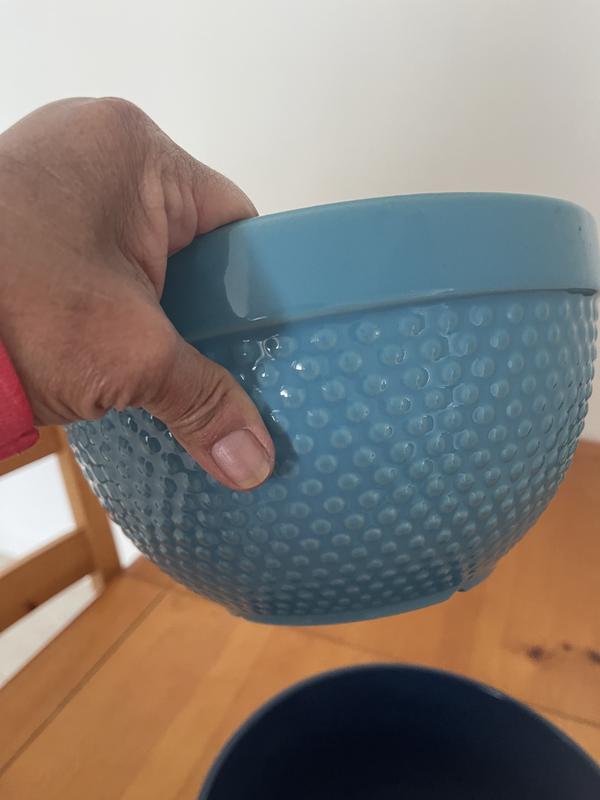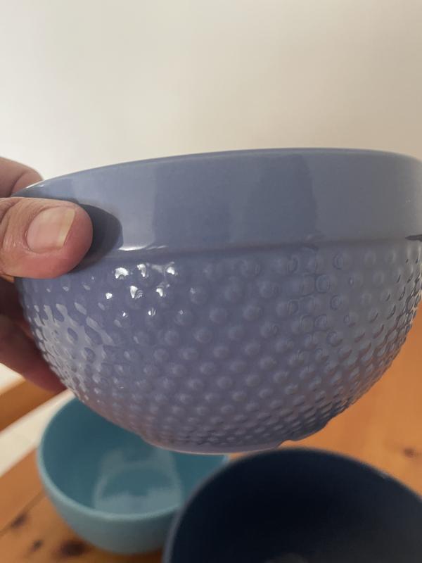 Beautiful blue ceramic bowls with nice texture to them! Love that I can use for table top serving as well.