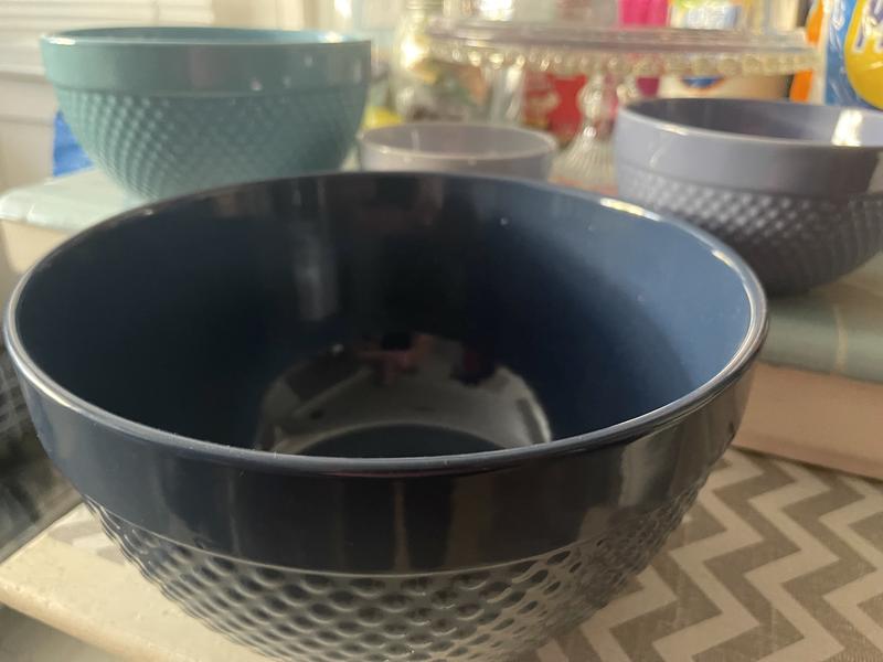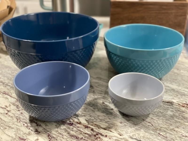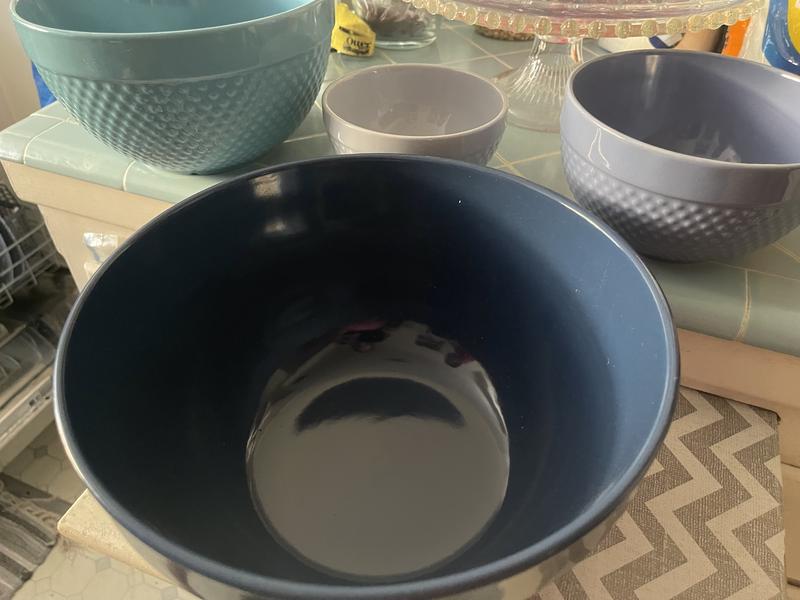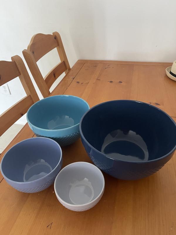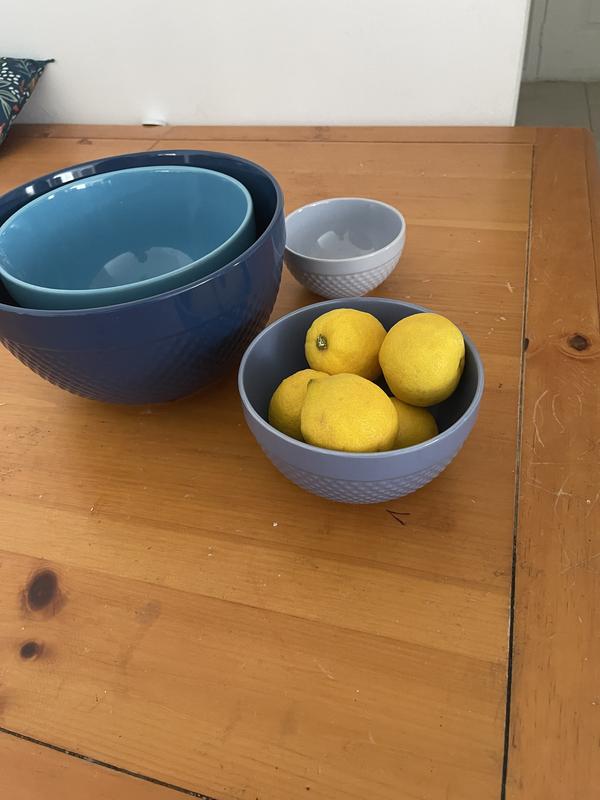 These stacking bowls are really pretty. I love the bluish color scheme, and they fit together nicely. They are really heavy-duty and hold up to everyday use. Plus, the mix of sizes means you always have the perfect bowl on hand. They are quite heavy, so make sure you have a strong grip on them when using.