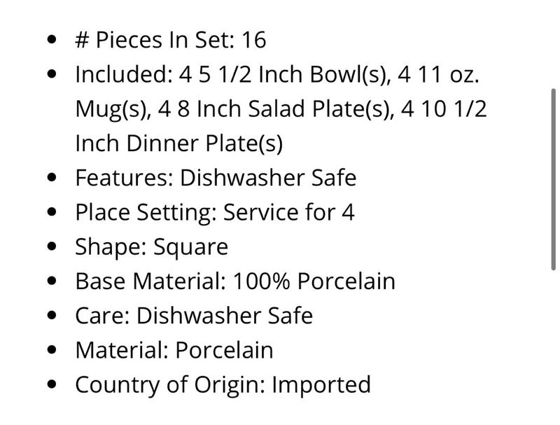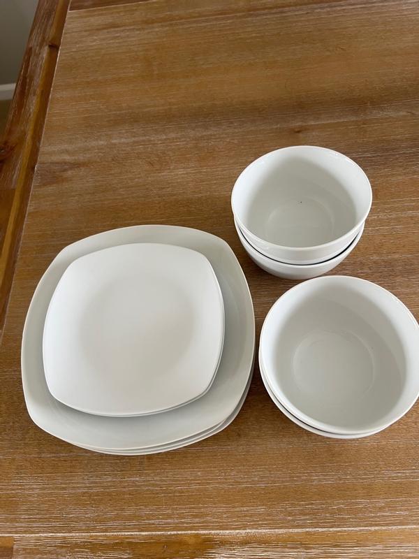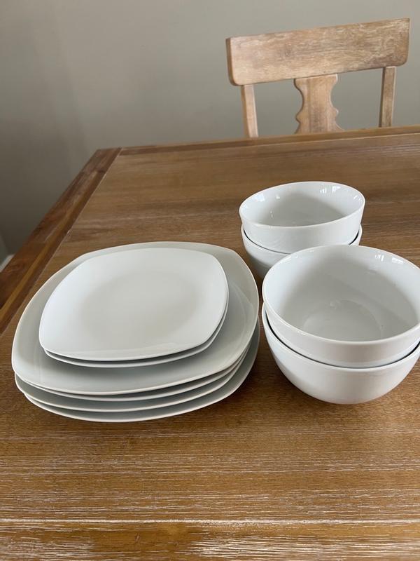 Classy dinnerware set for a reasonable price. I love the white color since it goes with everything. Durable and feels of good quality. I love the size/shape of the bowls. Great collection and perfect price for a starter set.