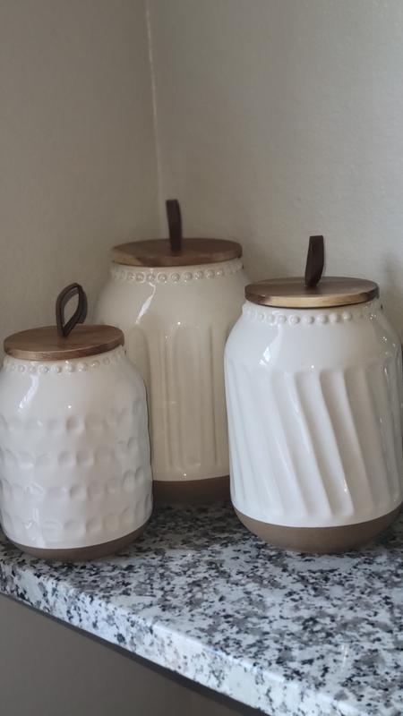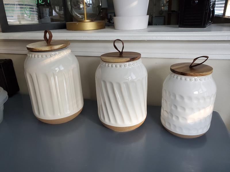 I love the 3 piece Ziggurat Embossed Canister Set Stoneware. They are beautifully designed and are so well made. They look very elegant and go perfect in my kitchen with my red accent pieces. Sturdy and practical