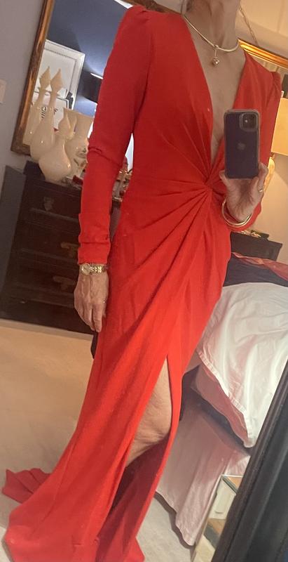 The simplicity of this design with the front gathering, low neckline and red orange color, create a flowing burst of elegance. I love it. The two negatives are the heaviness of the dress material with lining (3lbs.) and how to walk with the long hem. If you are super busty, then you may need to sew a few closure stitches. May need broad enough shoulders and decent height to carry the dress. 5’8”, 135 lb., bought M, usual size