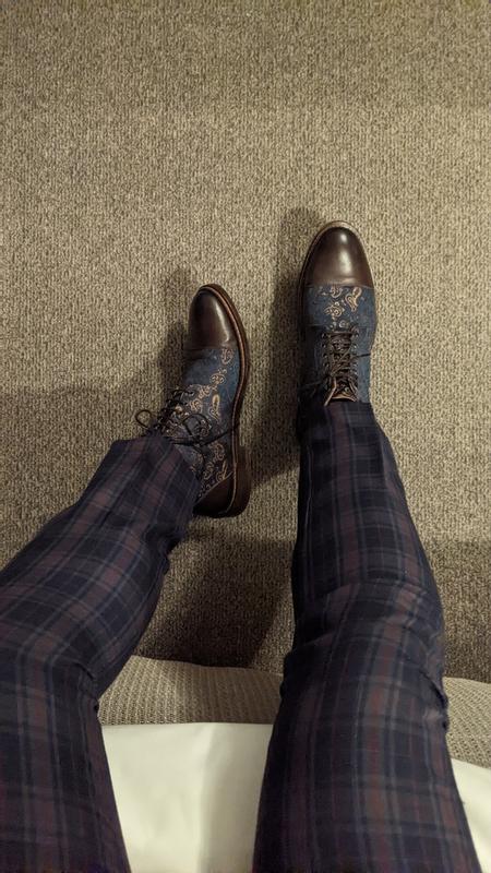 We bought the brown paisley, the blue is very beautiful. Hubby is typically 11. 5 but 12 leaves enough toe room.