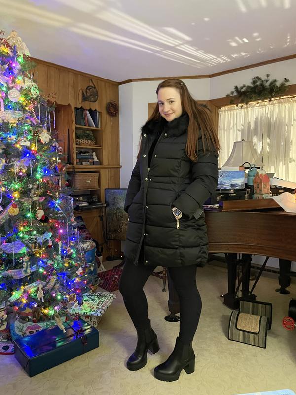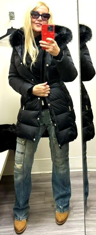 I love the fit and feel of this car length puffer coat. It does not feel bulky and the furry hood is luxurious. I am so glad to have found it on Bloomingdales and will return again & again.