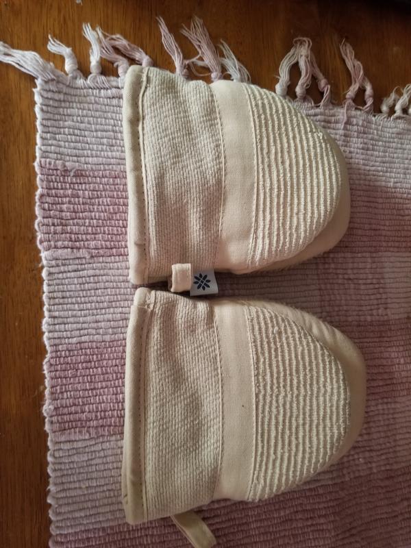 These mini mits are perfect for handling hot cookware. The material is nice and thick. I love the color and overall design of these mitts. They have loops that make them easy to hang on hooks if you want to hang them. These can be easily cleaned in a washing machine. I like that these mitts are not only cute, but durable and functional.