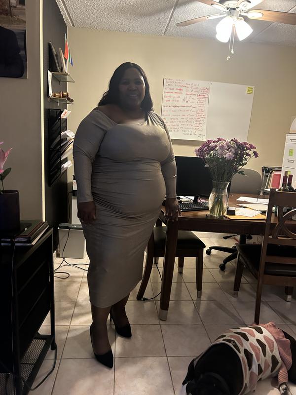 Web ID: 23868475Styled with an off-shoulder neckline, this Taylor plus size maxi dress has long sleeves and a side ruching for a body con fit. Designed with a metallic finish and side seam zipper, it is lined for holiday party and cocktail occasions.