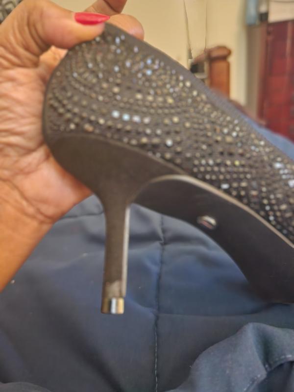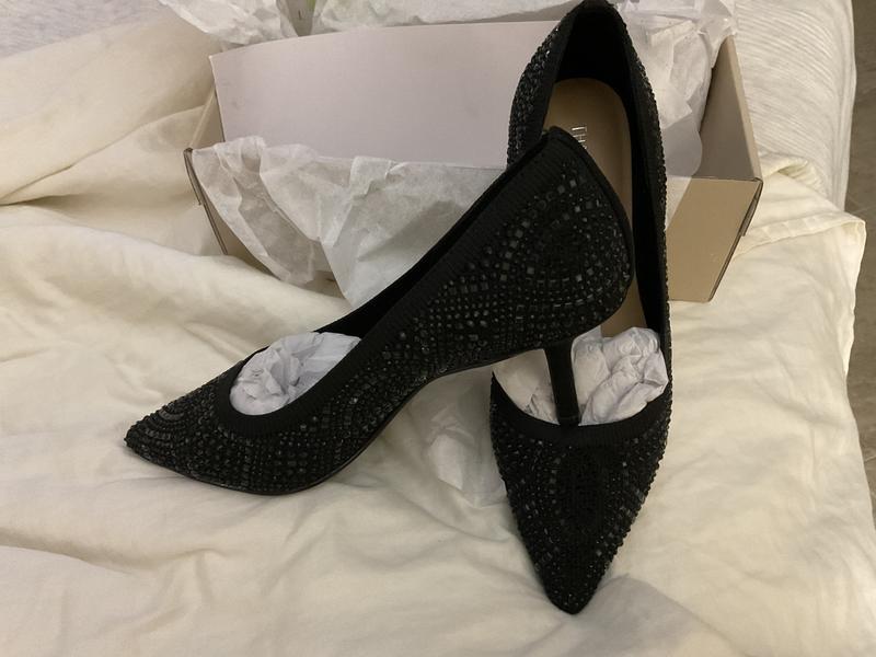 I thought this low heeled jeweled pump would be comfortable due to the stretchy band around the top of the foot but it wasn't. The pointed toe is tight and squeezes the toes and the border sides rub on the right side of the foot. I went to Macys and tried on the 8 but it was a little too big and slipped off when walking. Had to return.