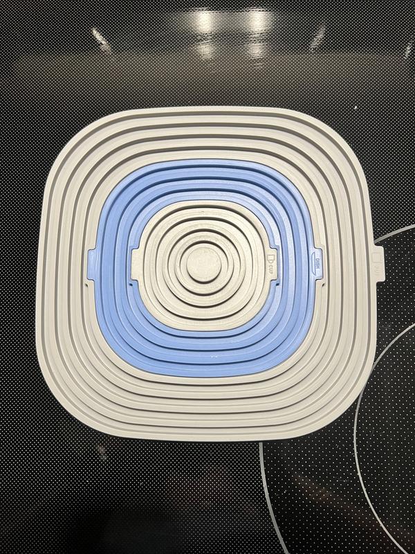 This set of 3 silicone trivets looks sleek and the 3 different sized trivets fit together easily. It is a good weight and when all put together will hold a large frypan or stockpot. However, it comes apart very easily when you grab it by one corner making it hard to use when you have a pan in one hand and are trying to move the trivet around with only one hand. I was also unsure which side was meant to be the top since the pictures on the box show it with the grooved side up. If you leave it grooved side up, it very easily collects crumbs in the grooves, looks messy and needs to be cleaned out. Finally, if you use it under a bowl or pot in the microwave you cannot wrap the sides up to cover hot edges to remove things from the microwave - it is too stiff and/or the pieces come apart.