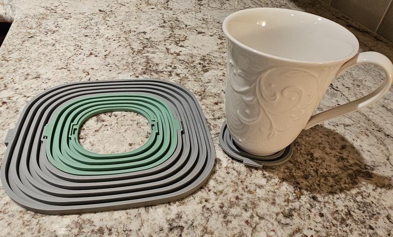I like this trivet because it is customizable to different sizes of pots, pans and cups. And not only that, there are three sizes in one trivet! The colors are subtle but match my kitchen perfectly! Also, each size is labeled for what they suggest it to be used for. I really like it!
