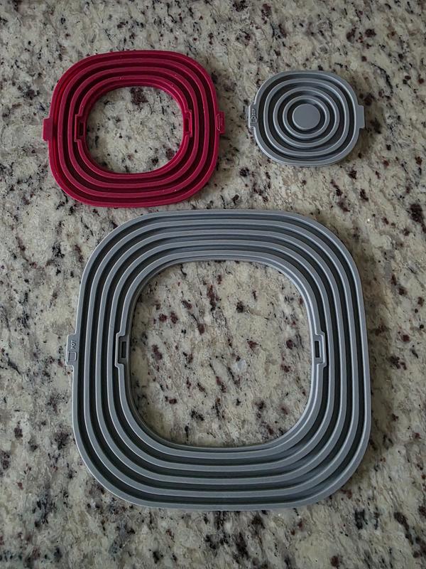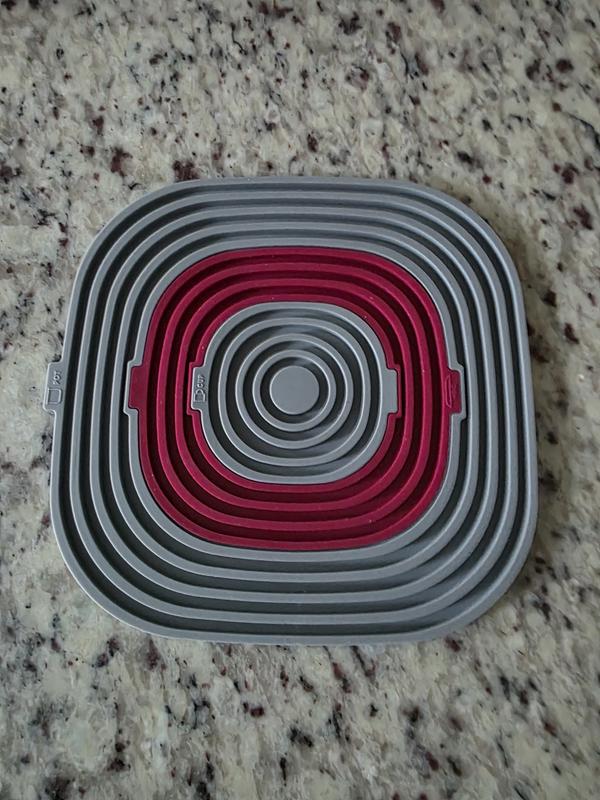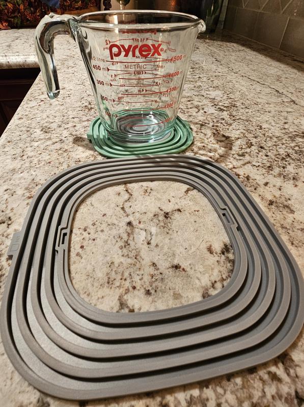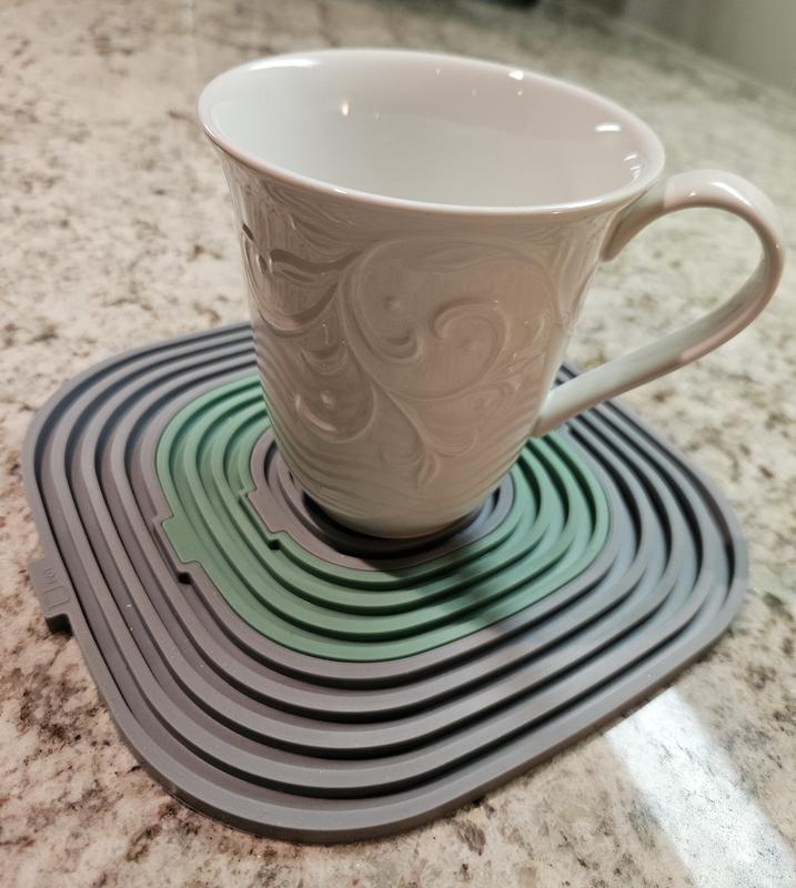 Very ingenious idea. This trivet can be separated into 3 pieces to accommodate dishes/mugs of different sizes. The two smaller sizes can be easily separated from the main piece and used in different situations. The smallest piece fits most cups/mugs. The middle piece fits small dishes/pots, while the largest piece fits medium to large pots. The trivet is made of silicone so it'll protect most surfaces from hot dishes/pots/mugs. The only downside: when stored as a single assembled piece in a drawer, it'll most likely separate when picked up. Not a deal breaker.