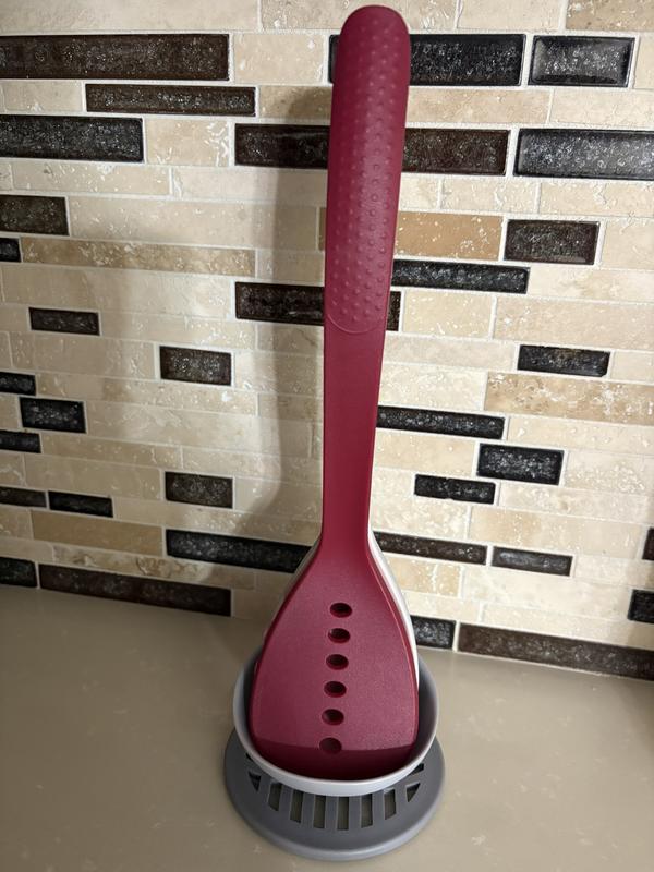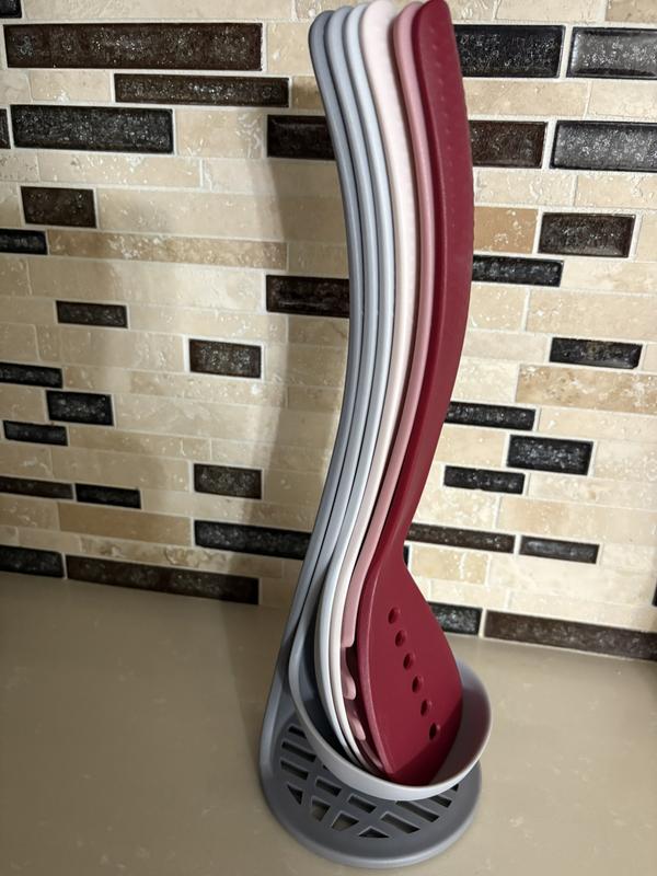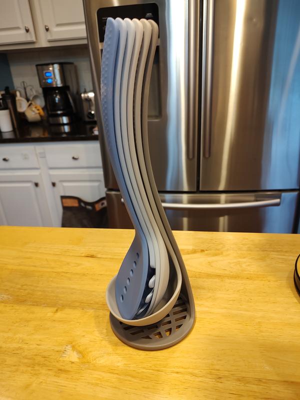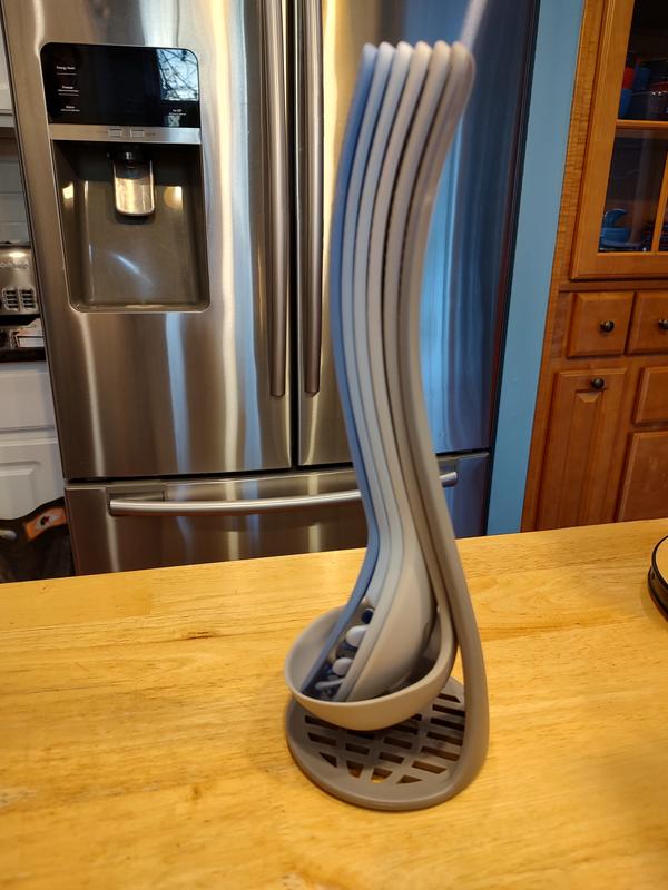 I was really excited for this utensil set because it's so fun how it nests together! The blue and gray utensils complement our blue kitchen nicely. I haven't used the utensils for pasta sauce or anything tomato-based yet, so I am a little concerned about the potential for staining. The set is dishwasher safe, which is always nice to have for the added convenience. The utensils themselves are a nice weight but not too heavy for regular use. The potato masher won't be as strong as a metal potato masher, but for softened potatoes, I think it will still do a nice job because of the way it is designed. The ladle is the linchpin to holding the utensil set together, but that is arguably one of the least frequently used items, so it shouldn't be too much of an inconvenience. Overall, this set would be great for a college student, newlywed couple, or young adult who is just starting out on their own and needs help stocking their kitchen.