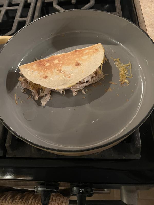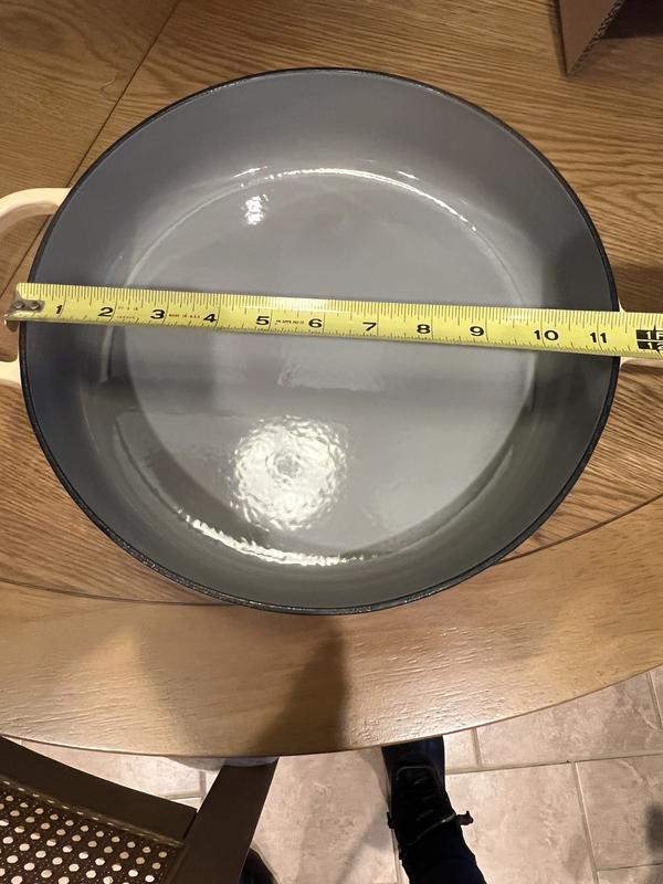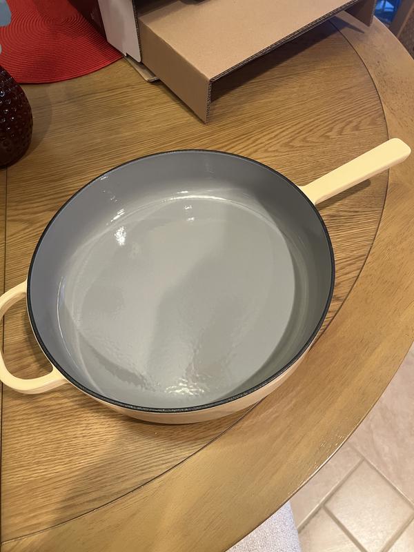 This is a really pretty cast-iron pan with matching lid to prevent messes. It’s a buttercream yellow, which is so soft and delicate looking; however, it provides the performance of cast-iron. This pan distributed the heat perfectly and has easy clean up.