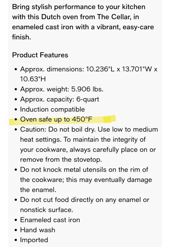 I just received my "Dutch Oven" early than expected. The description on the website says oven cooking up to 450° while the insert inside the box says use low to medium heat settings. After looking over everything in the box I see "Safe for oven to 500° F. Dutch ovens are purposely made to take on more heat so the insert inside was quite confusing. But then, no where on the box does it say it's a "Dutch Oven." It says 2-pc round casserole 6qt enameled cast iron. It is HEAVY and beautiful. I do hope it lasts, I just don't know how my higher heat dishes or fresh bread will hold up.