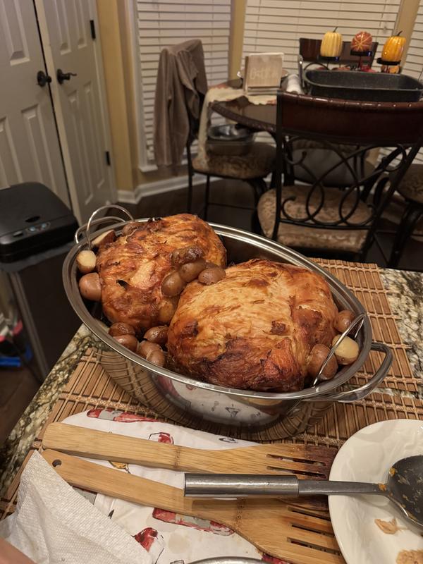 It took a while to find a roasting pan with a lid and I'm glad I waited until I found this one. The rack is easy to lift out of the pan. The dome is high giving plenty of height for the meat. The clean up was easy after a short soak. I am very happy with this roasting pan.