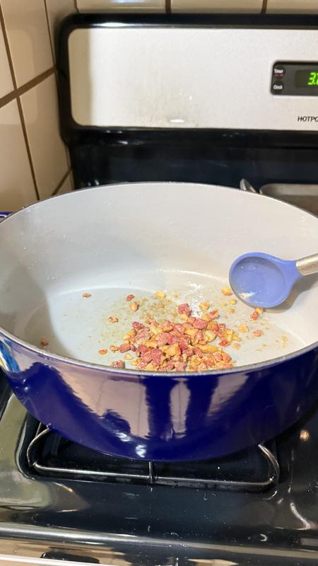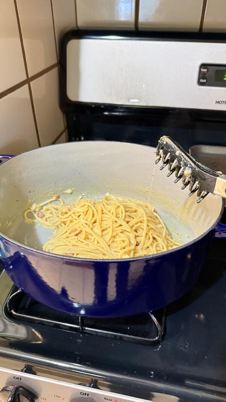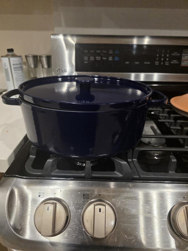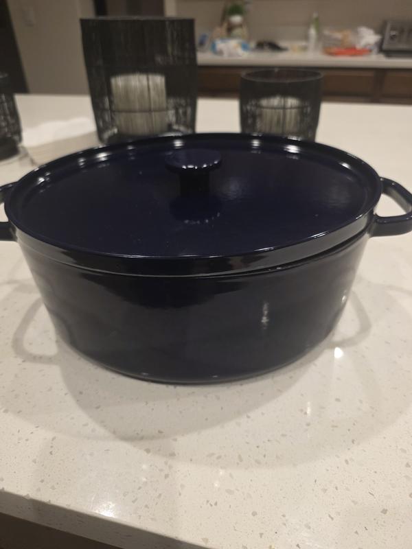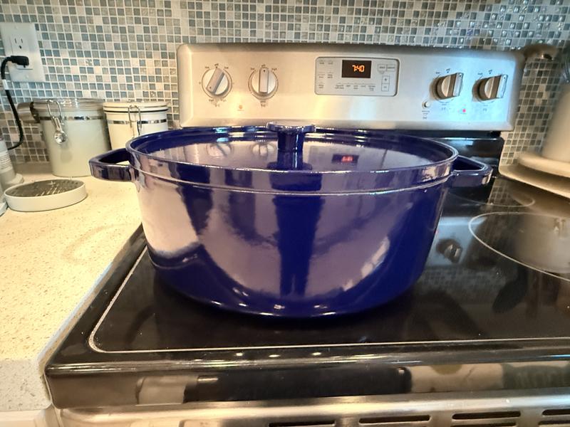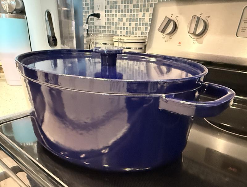 Beautiful Dutch oven! Love the blue color, definitely an eye catcher! Not heavy, easy to wash and just in time for the holidays!! I find myself reaching for this one and truly one of the best that I’ve used thus far! Highly recommended!