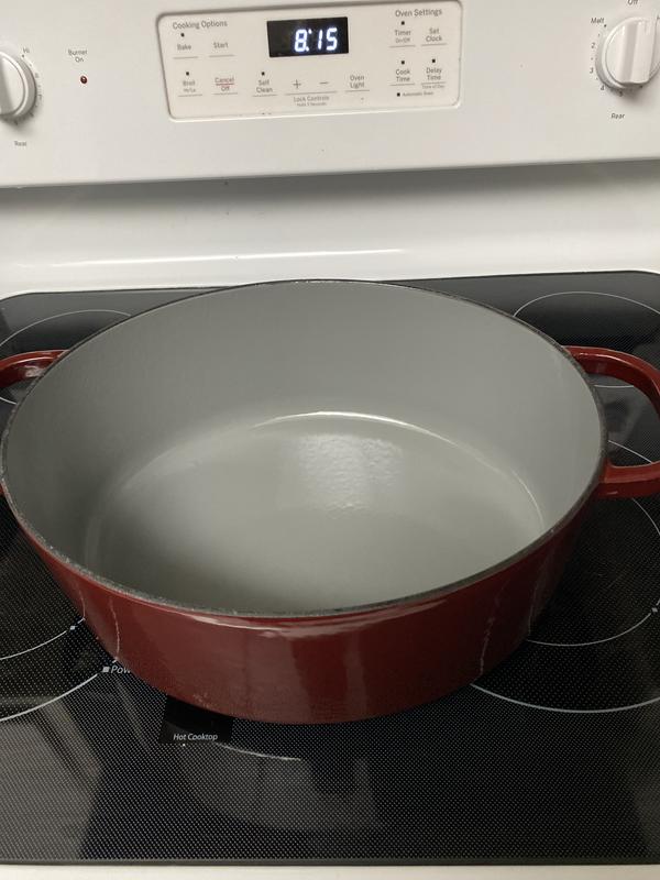 I am in love with this dutch oven. It's much bigger than I anticipated. The color is beautiful and vibrant and the light grey color on the inside is a nice compliment. I have an older dutch oven the came with a stark white color on the inside. After a few uses, the color changed to an unpleasant beige. I don't see this happening with this one. Love it!