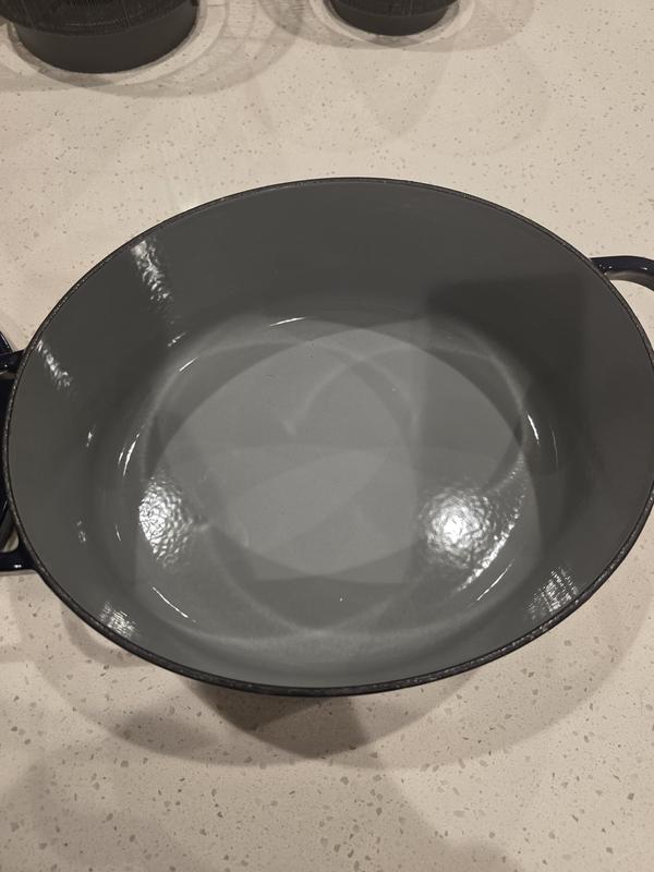 This cast iron pan with matching lid is a gorgeous dark blue and sized adequately to entertain. I would highly recommended as it was easy to clean and functions as a one pot meal dish. The weight of it is substantial.