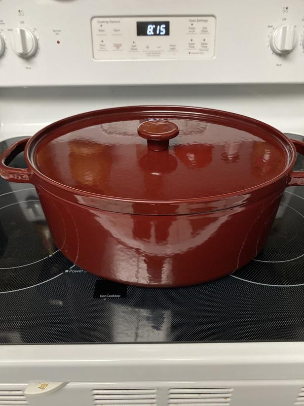 This material is super sturdy, heavy-duty, and stable! It’s cast iron with a polished finish that really helps keep your food from burning. Plus, the lid is also cast iron, which keeps your food clean and warm for a longer time. Since it’s cast iron, I can use it in the regular oven for cooking. Just a heads-up, it’s best to hand wash it to keep the polish looking great. Also, try to avoid the dishwasher to maintain the polish’s condition. I absolutely adore the size—it’s perfect for a family meal!