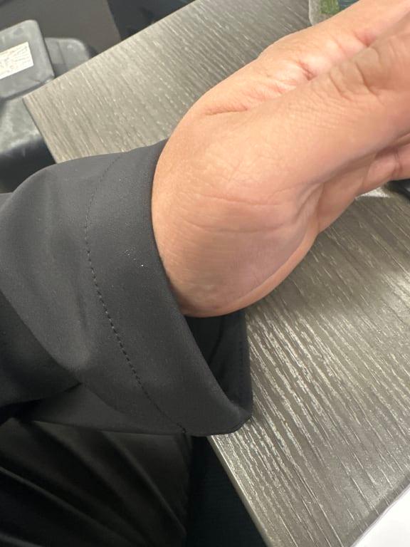 No elastic around wrists and no hem like described and pictured. Took 2 weeks to get and it’s a piece of thin and noisy garbage. It’s going back ASAP. Shame on NF and Macy’s for false advertising.