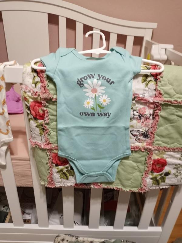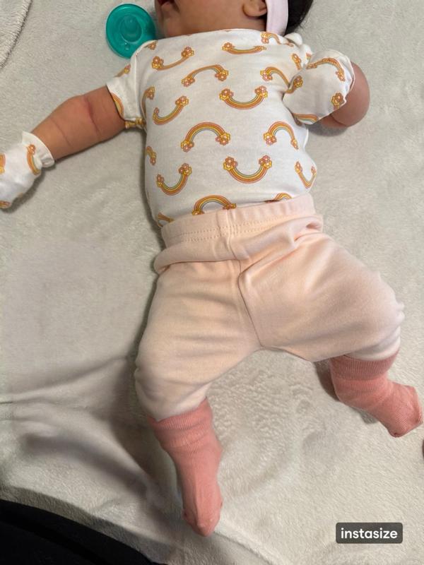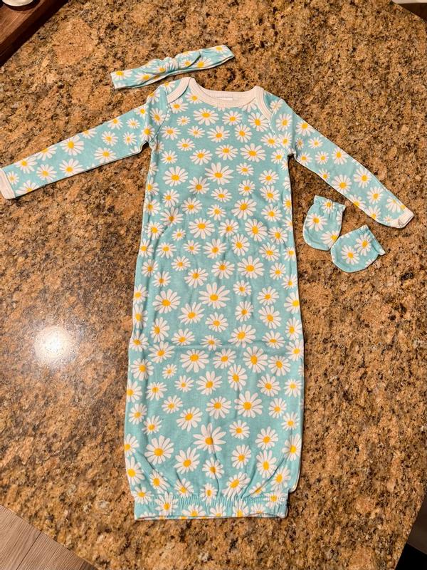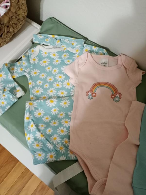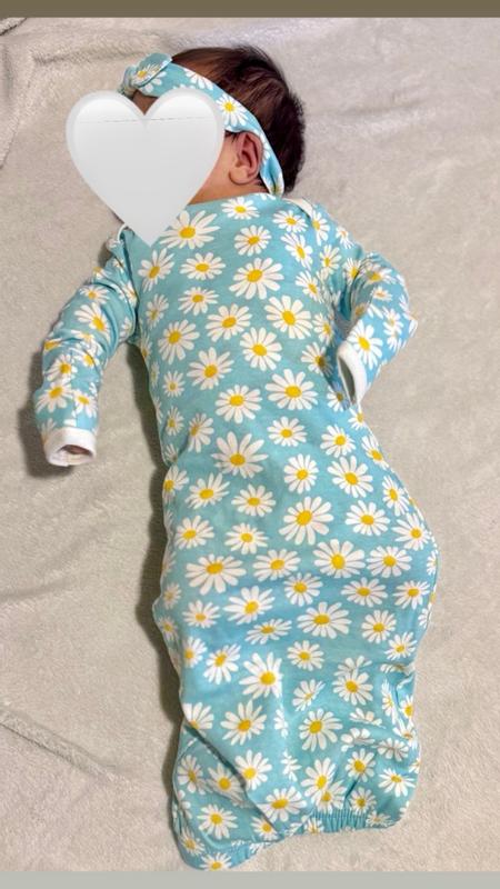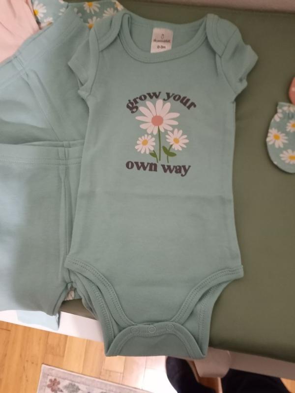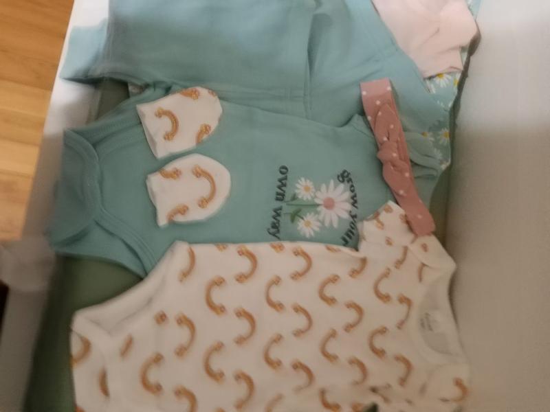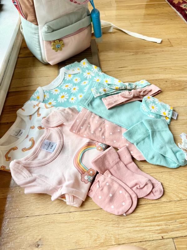 This set is so versatile. I love that the onesies, pants, mittens, and sleep sack are 100% cotton and the socks/headbands are mostly cotton. Everything is super soft, especially the socks. At 7 weeks old, my daughter fits into everything and will hopefully fit for a good while. Everything is still slightly big on her, except the mittens which are a bit tight and the socks that are pretty big still. But overall, that’s preferable so the clothes fit longer. My favorite pattern is the blue daisy sleep sack. The stretchy, open bottom is nice and having a different type of sleep sack is super useful. It’s warm enough to be used on its own and we will also use it under a thicker swaddle at night when it’s cold.