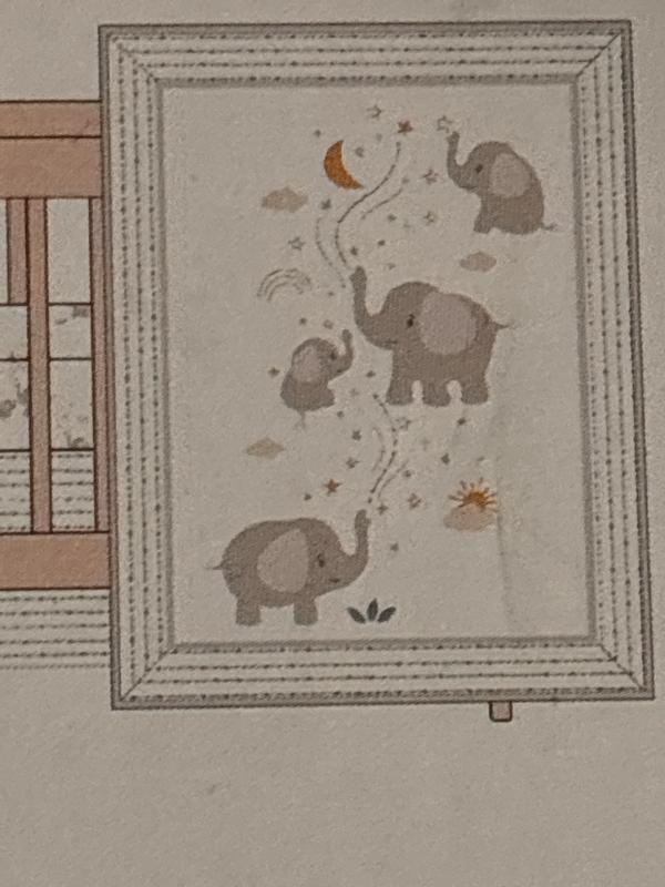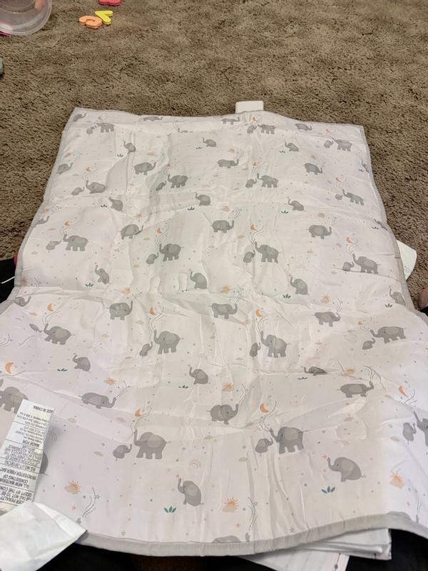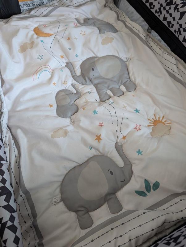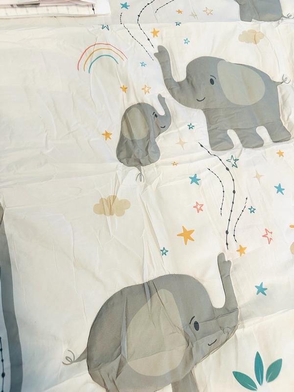 I had to wash these once. I took them out of the box that’s why they’re not one actual baby bed. They’re so cute. The elephants are so cute. It’s so soft but I wanted to wash them because I didn’t know. I just don’t wanna put it on a brand new baby until they’re freshly washed and baby wash the print one is adorable. It fits good the skirts a little bit too big for a baby bed but we just pen it and it’ll work that picture later. It has a nice texture. A really cute design little elephants on it .