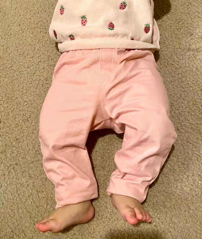 More clothes for baby! Perfect fit and just in time. No zipper, all pull up. No pockets. Good waistband. True to size and a good length. Baby boy approved!