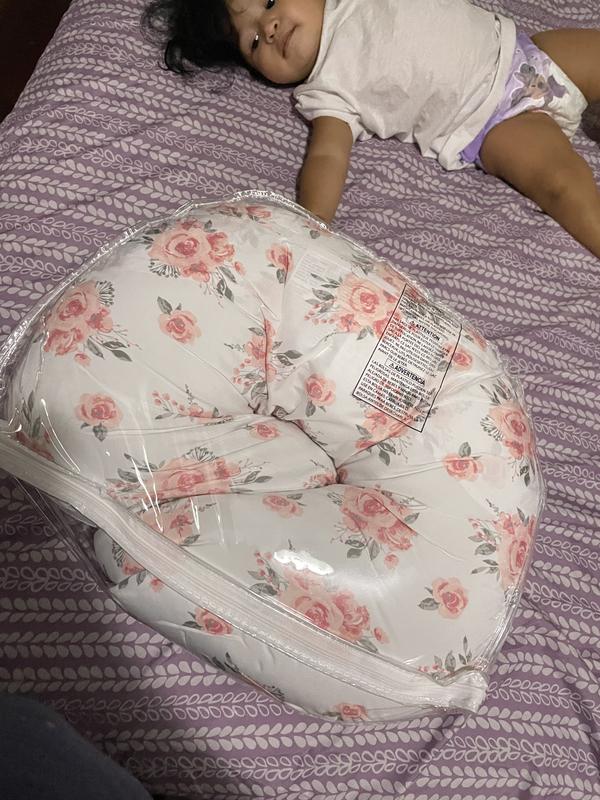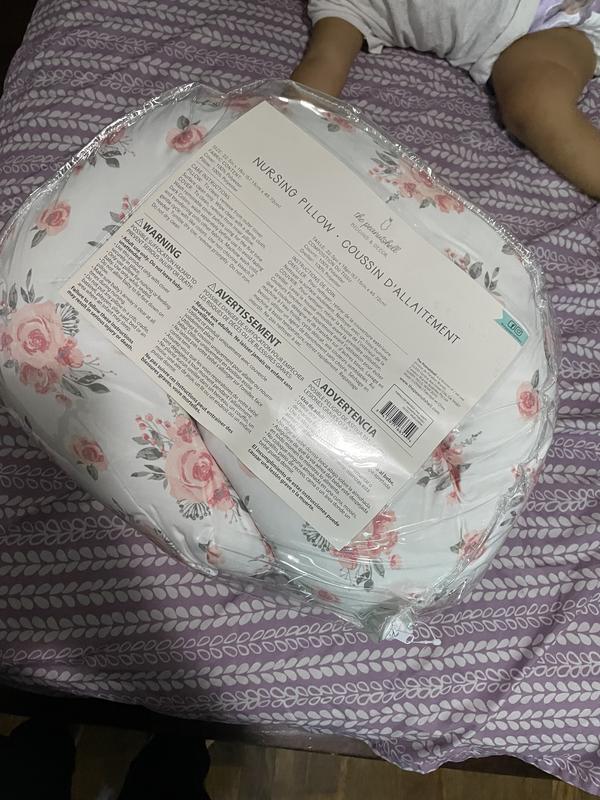 This nursing pillow is so cute - its even better in person. It fits the baby snuggly enough and allows the baby to nurse comfortably. It's white with pink flowers, which are adorable. Soft, and you can easily remove the cover to wash.