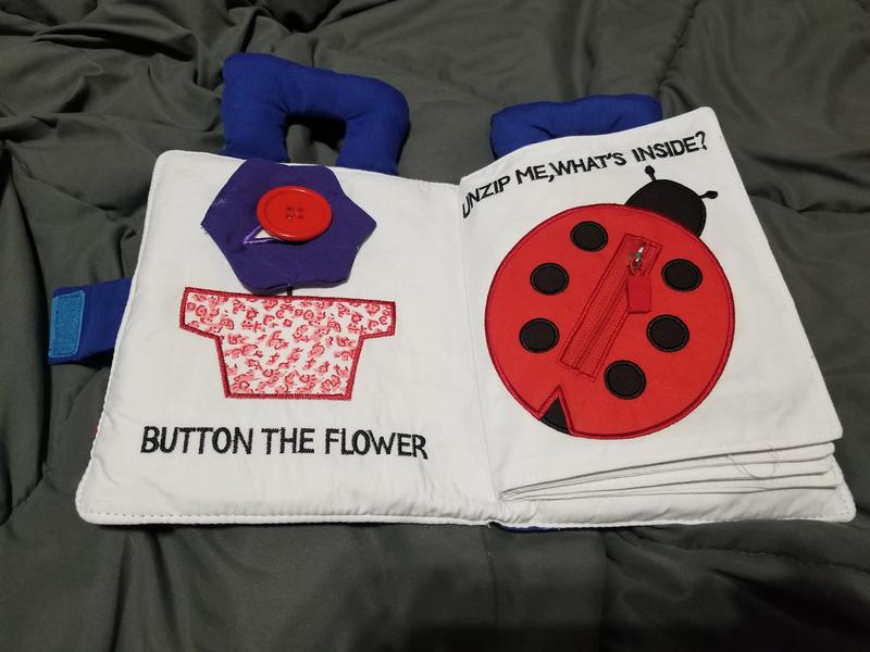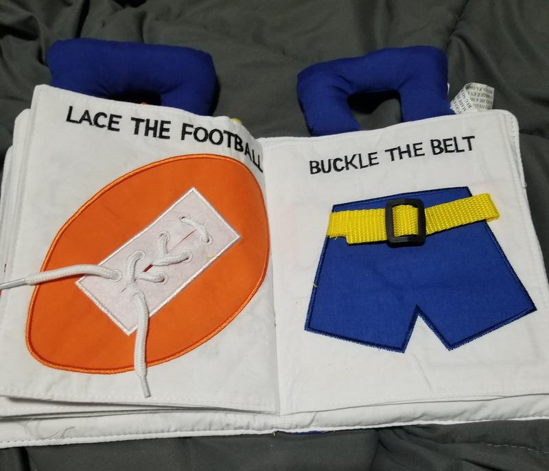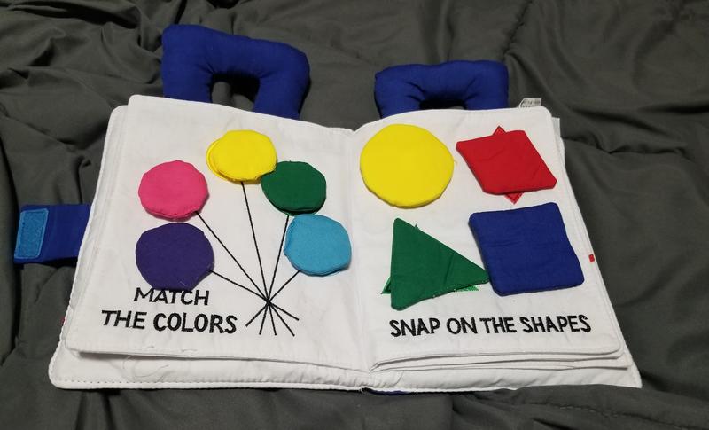 This is such a cute book and is perfect to take on the go when you need to keep your kiddo occupied. My son is about to turn 3 and really enjoys playing with this book. It definitely helps keep him occupied. He plays with it on car rides, doctor appts, and etc. This is great for motor skills and just teaching them new skills such as tying, zippers, buttons, colors, shapes, different textures and etc. It has carry handles and a velcro strap to keep it shut when not being played with. It is good quality and not cheaply made.