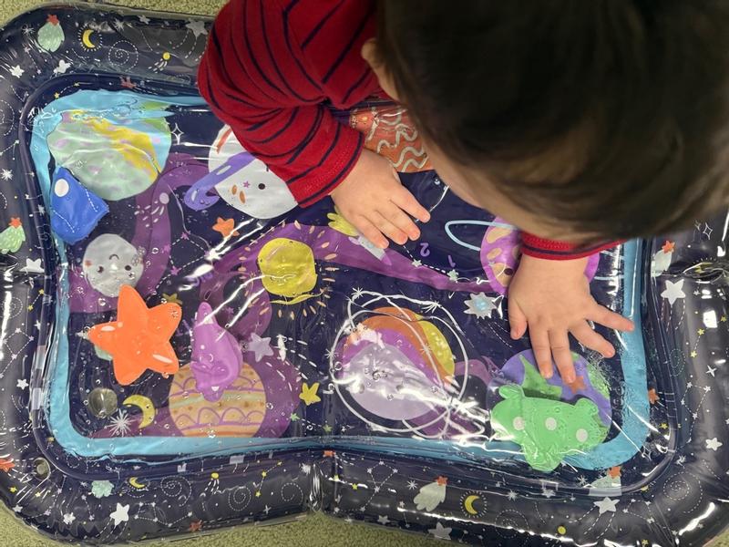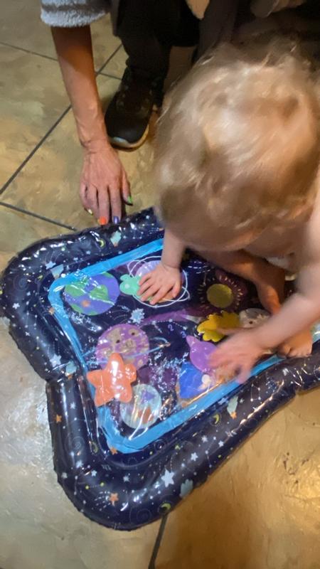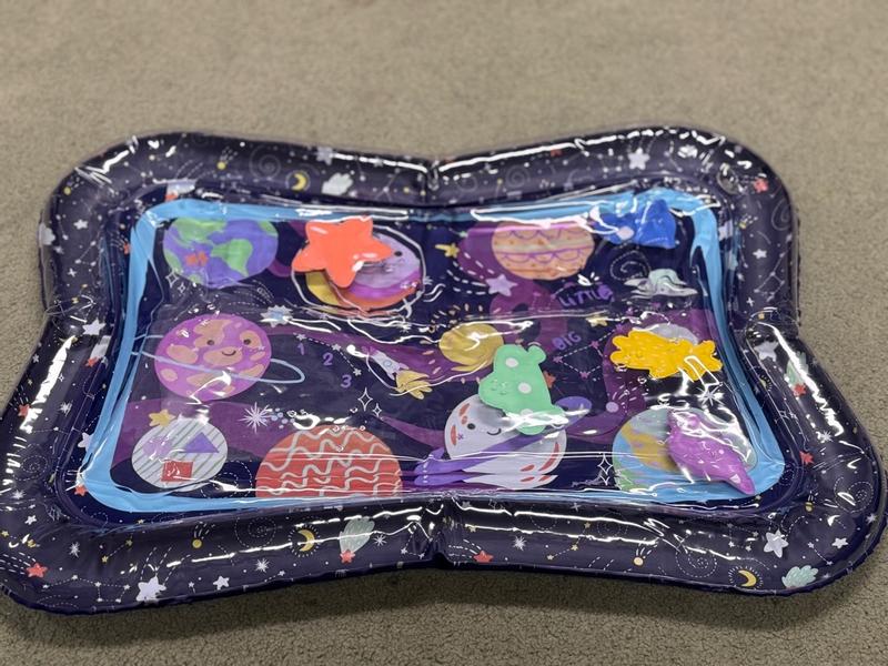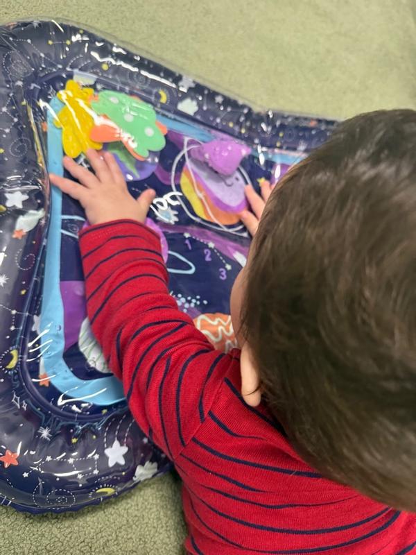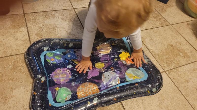 This space water play mat is great for my baby boy. I have a 7 month old baby that will play with the water mat multiple times a day. He likes to look at the color, shapes and tries to move the floating items. It’s easy to add water, easy to clean, and the material seems nice and thick (no leakage or mold). I rate it 4/5 because I had a hard time inflating it as you can see in the photo. But other than that the product is great for my baby.