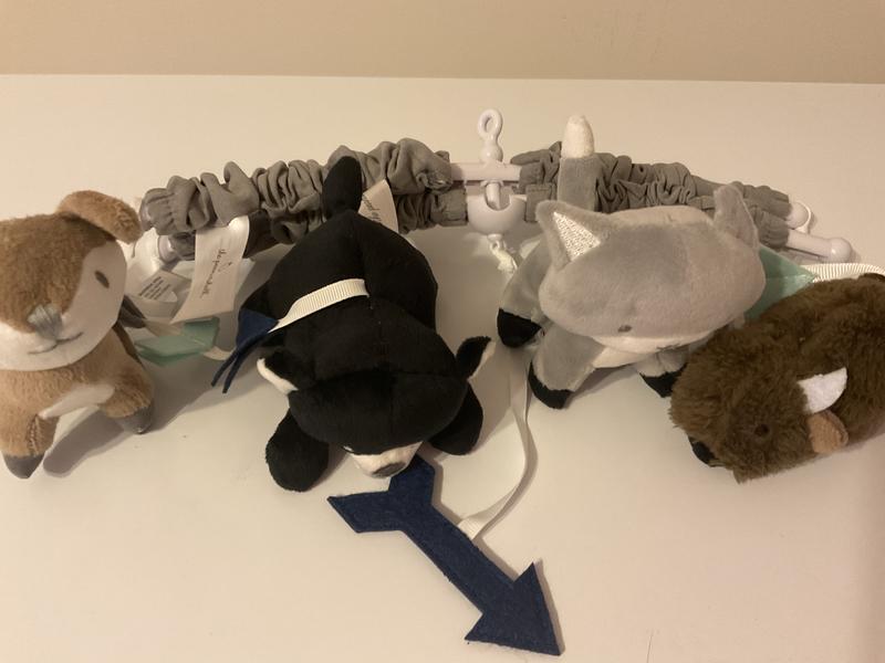 This mobile with stuffed animals is adorable. My soon to be burn grandchild is going to love it. The animals are well made and durable. They are eye catching. I can’t wait to watch the baby stare at it. The mobile arm is strong and durable and attaches nicely to the crib. I’m so excited about the animal theme.