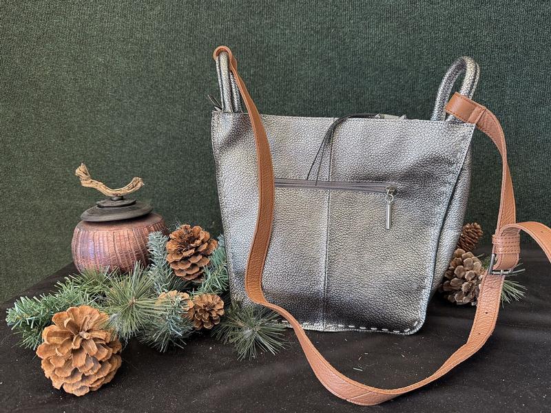 I absolutely love this bag. I love the antique silver color, the big loopy handles, the leather shoulder strap, the small pockets inside, the light-colored interior, AND the fact that the bag stands up on its own! Thanks for thinking of everything!!