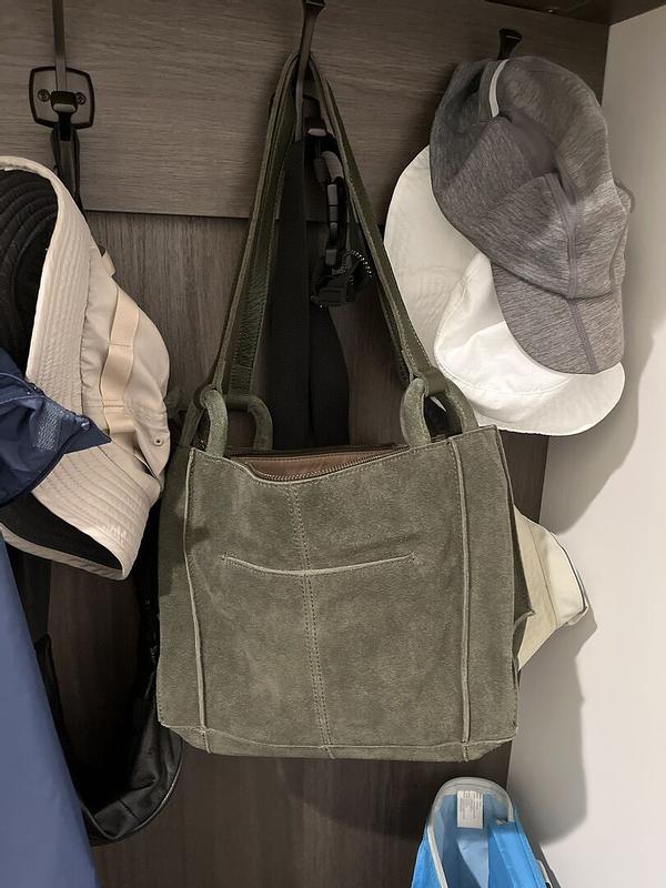 Beautiful bag in moss suede for the fall; stylish and easy to carry on a daily basis to work or play!