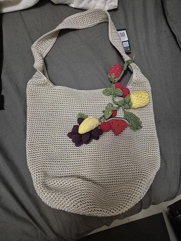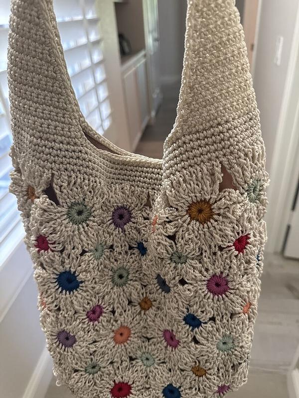 Beautiful bag and I love all the beads. The bag goes with everything! What I don’t love is that I have been carrying it for a week or so and already it has stray strings coming loose from the crochet work. I don’t know how long it will last. I have several Sak bags and none have done this.