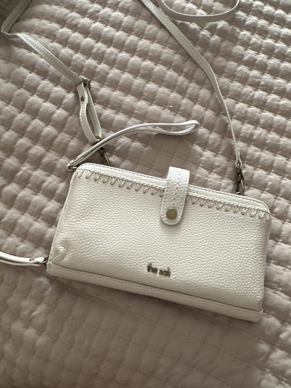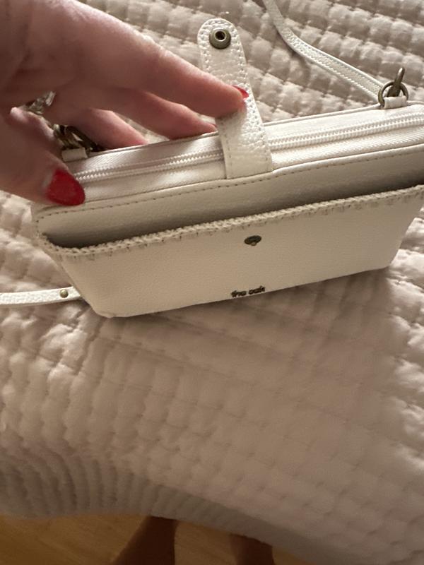 This item is nicely designed and I like its lightness and compactness, and the way I can wear it crossover style. It is great for the grocery store, as it frees my hands. The change purse in the center is very handy. . The demerits concern the tightness of the side opening for a cell phone… it’s difficult to extract, especially when in a hurry. Also, the slots for the credit cards are a tight fit, and it’s a struggle to get cards out.