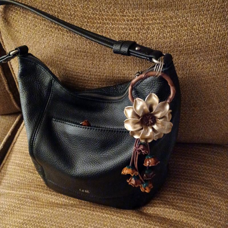 This purse is much better than I thought. I'am able to push the top of the bag down a little to make it look more slouchy. Great leather bag! If you want the purse charm, look on Etsy. 🙂