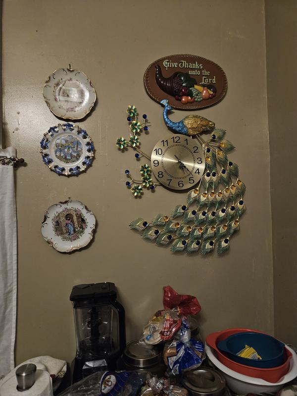 This clock is beautiful. I love peacock figurines and photos and this one matches all of the ones I have. The only thing, the second hand on the clock is flimsy and bends. So, if you buy it be careful with the second hand. Other than that little problem, the peacock is beautiful.