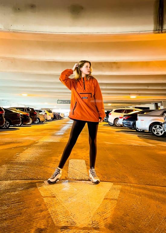 The color is amazing! I wear this around Columbia's campus all the time! It wears well with sweats or pants! Perfect for a light jacket. Lots of pockets too.