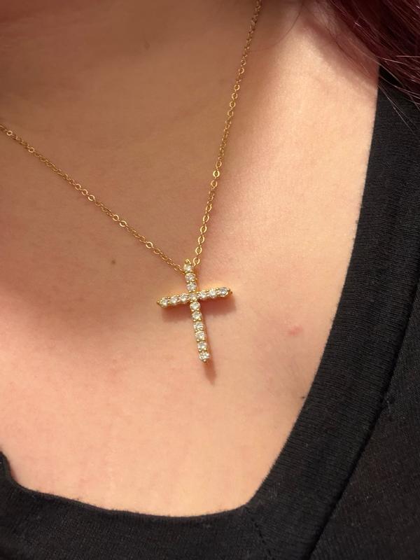 Elevate your style with this elegant gold-plated brass cross necklace. Featuring a dazzling array of round-cut cubic zirconia stones, this timeless piece adds a radiant touch of faith and sophistication to any look. The fine craftsmanship and meaningful design make it perfect for both everyday wear and special occasions. A thoughtful gift that symbolizes love, hope, and devotion.