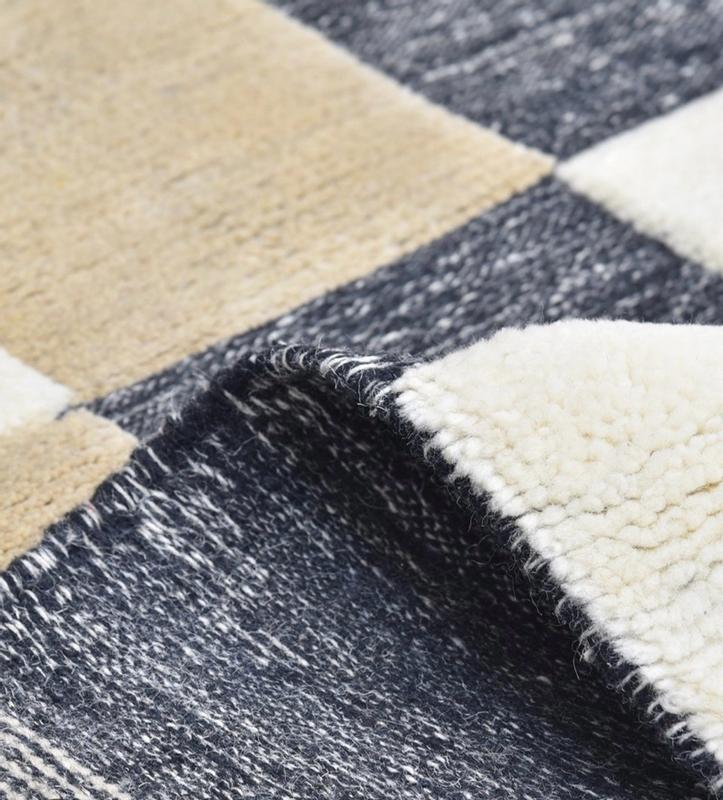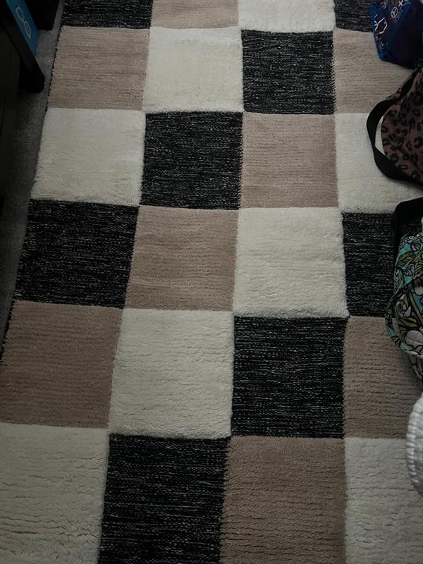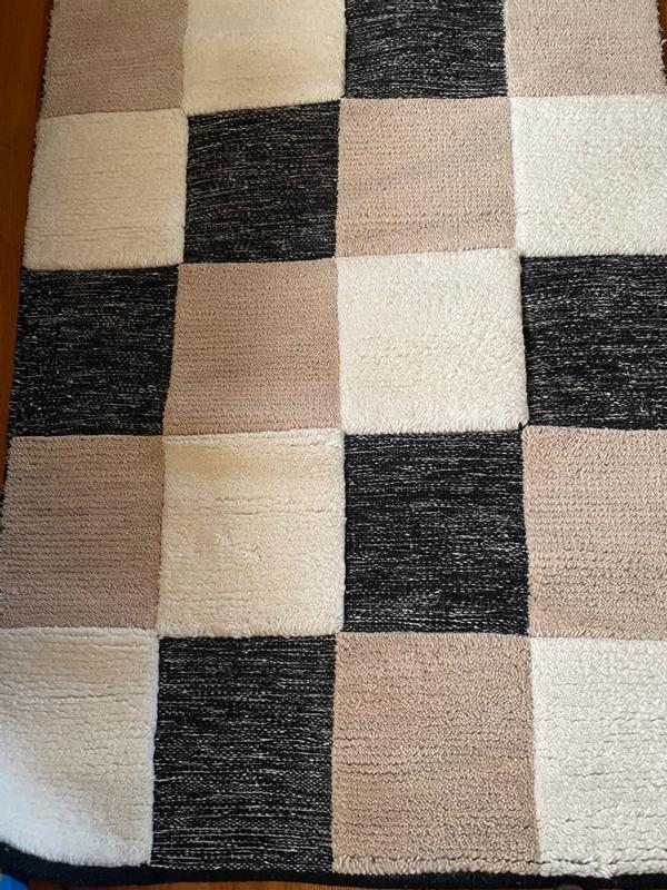 I like the neutral colors and pattern of this rug. The squares in the pattern are different textures, but I didn't have any issues with that. It's wool and it cleans easily. It's a quality rug that feels durable and well made.