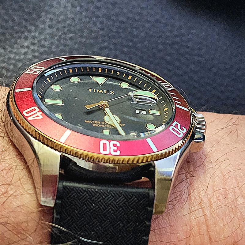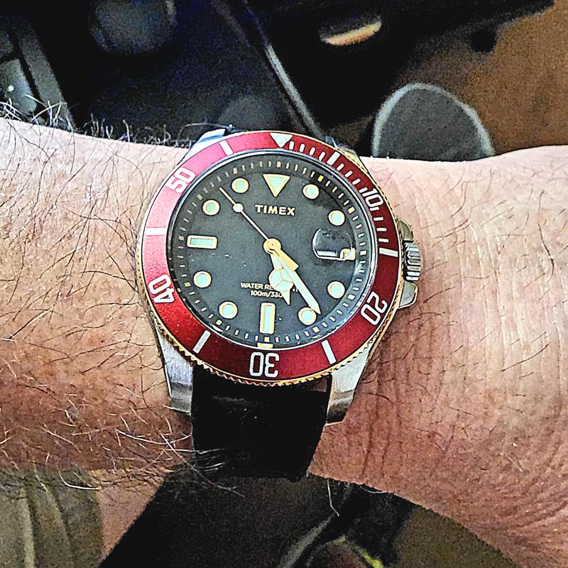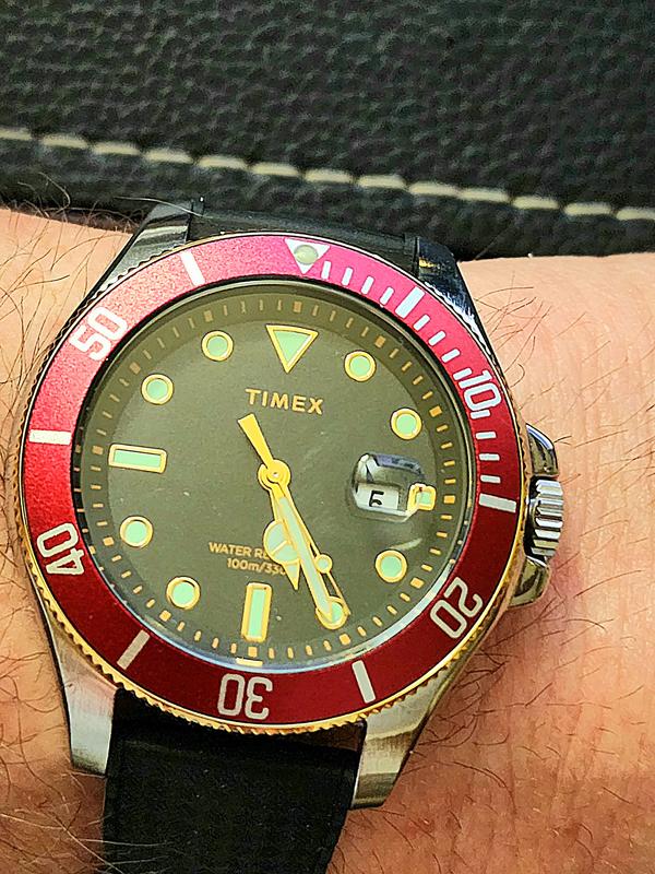 This handsome watch keeps perfect time. I use the elapsed time ring to time my dog walks.