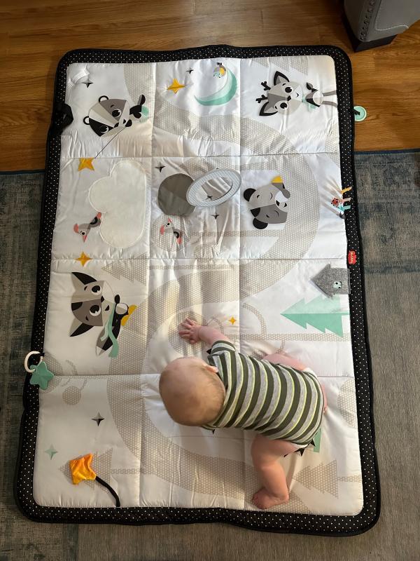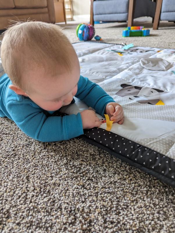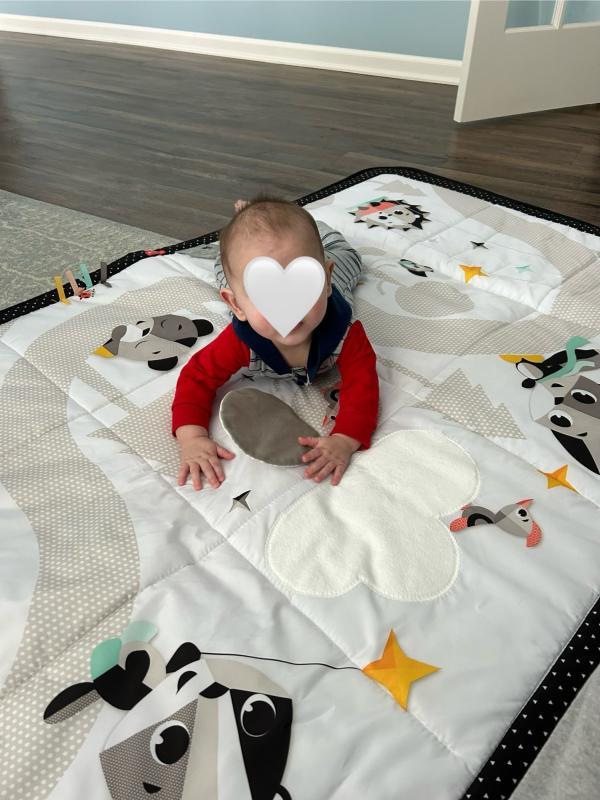 My son and I both really enjoy this mat. It is the perfect size, not to big but not to small. The color contrast is perfect for him since he is three months as well as all the little textures and tags and details. It keeps his attention since there is so much to do and look at. I personally like the feel of the fabric, it's soft for him and also cleans up well when there's an accident. Overall it's super cute and gives us a lot of playtime together. I would 100% recommend this mat. I received this product through the stellar product testing panel.