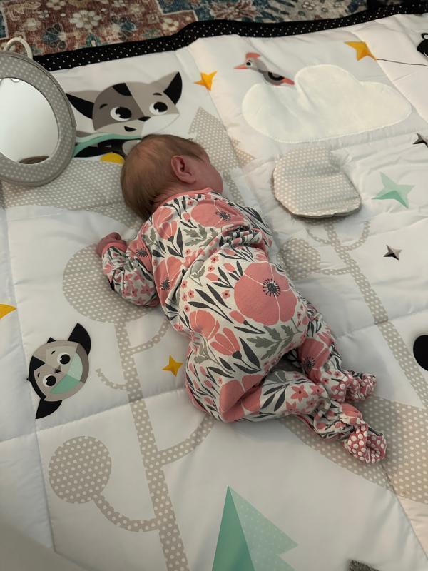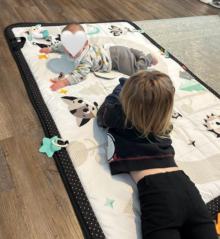 I received the product through the Stellar Product Testing Panel. We love this mat for tummy time at our house! I have twins and it's the perfect size for each to have room to explore and kick around near eachother but without having to be on top of one another. The material is perfect for setting down on carpet or hardwood as it's thick enough to provide comfort for baby. The various activities that come standard on the mat provide areas of exploration throughout, without having to purchase additional pieces. Although there are even more activities that can be purchased, The only con or area of improvement would be storage. Because of how much I enjoy the mat, I wish we could bring it with us places with a bit more ease. Due to the thicker fabric, storing it has a bit more bulk and it does not come with a carrying case or the ability to fit in a diaper bad. Overall I cannot recommend this mat enough, especially with twins. Having twins, so often you have to get two of everything. With this mat you get a fun, comfortable, safe environment for both babies to kick around and practice tummy time without having to double the number of mats. All will being able to enjoy a beautiful and simply designed product.