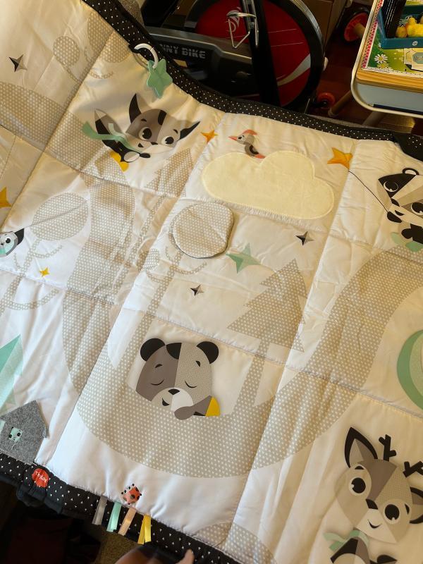 Aubster here, overall, this Tiny Love Magical Tales Super Mat has a B+ rating. It has beautiful crisp colors, the animal designs are super adorable, and the various interactive pieces are sturdy and age appropriate for 0-3 months (i.e. the bits of colorful cloth that overhang the edge, the little felt house that flaps up, or the small crinkly section). I have four kiddos, ages 6, 4, 21 months and 3 months, everyone likes the mat, and older kids enjoy resting on it with my newborn. Tummy time is a breeze because the fabric is easy to wipe clean (spit up), the pad is thick enough to protect my little from the cold hard wood floor and the tiny headbutts that accompany tummy time. It's spacious enough for everyone to cuddle, and cute enough to be a great backdrop. The B+ rating would be an A+ but it has two critical flaws. Firstly, the interactive mirror is not well designed, the supporting structure is too ridged and the swath of Velcro too small, it pops open all the time. The mirror has become a car toy for my almost 2-year-old (to be fair he really likes it!). Secondly, the mat doesn't wash well. We have a top load washer without an agitator, maybe that's why I haven't had luck with a machine wash. I have to handwash it to ensure it's clean. We have a Lab-Aussie mix in the house, so between 6 people and a dog, the beautiful white fabric doesn't stand a chance. It's also an "air dry only" item which isn't super convenient for this busy mom. I hope this helps. Congratulations on your bundle of joy! Love from Borger, TX! Thanks to the Stellar Product Testing Panel for providing me with this baby gear!
