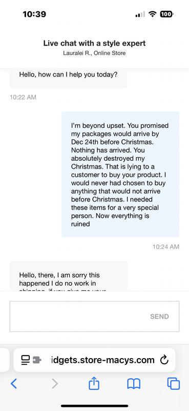 Please please do not believe that Macys will honor what they say. This was an item promised me to be delivered by Dec 24th in golden letters under the item. No one took care of the problem. They are aware that the item will never arrived on time but still will mislead you to buy it. Horrible customer service, dishonest, greedy corporate business. Will never buy with Macys again.