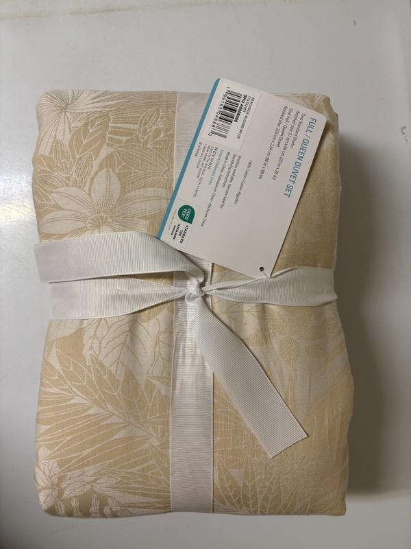 The duvet arrived without a box, just the duvet set in a transparent plastic bag with my address info. First impressions: The fabric is VERY SOFT. You can tell this is very well made. I even checked to see what it was made of and was surprised that there was no polyester- this is a cotton/linen blend. The palm print is very well placed on the fabric so you don't get weird repeats. My only problem is that when I put the standard shams on my standard size pillows, I had to really use some muscle strength to get it in. They're very small and don't have much wiggle room. The duvet has large, clear buttons and is a little thicker than one of my regular ones so it will protect my investment. I can't get over how soft it is though. I'm gonna be sleeping like a baby!