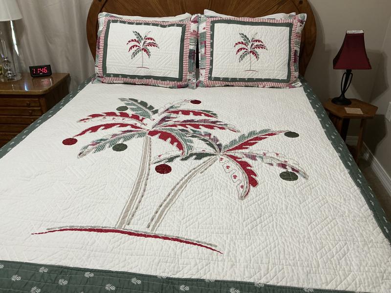 Nice Christmas edition of the bahama palm tree quilt…especially since the shams were included. See my review of the island palm tree quilt that did not include shams and could not be found anywhere on the internet. Buy with confidence…fits a queen bed perfectly