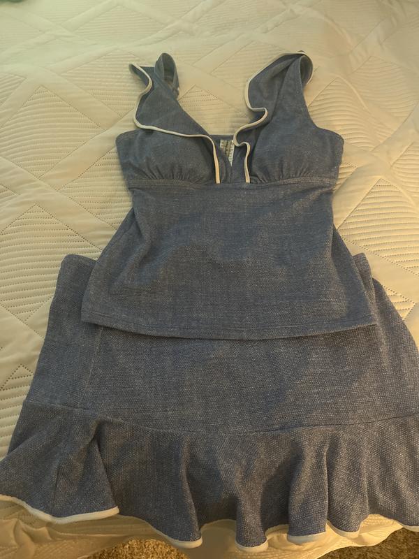 Too many ruffles with the top and the matching skirt. Love the color and concept , just too much going on.